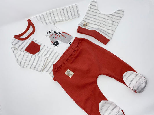 Baby Set 3 Teiler Strampel Hose Body Mütze Mützchen Jungen Zebra Terracotta